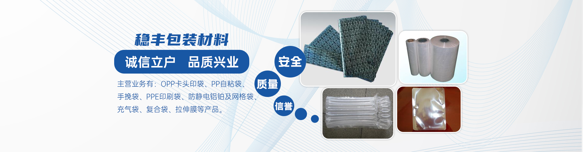 東莞市穩豐包裝材料有限公司,主營業務有:OPP卡頭印袋、PP自粘袋、手挽袋、PPE印刷袋、防靜電鋁鉑及網格袋、充氣袋、復合袋、拉伸膜